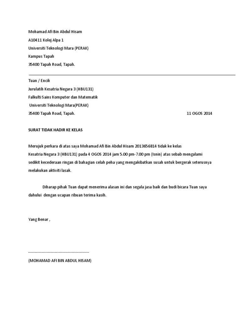 Surat Tidak Hadir Ke Kelas / Saya ahmad bin said bapa kepada murid bernama yusman bin ahmad dari kelas 5 bestari ingin memaklumkan sebab anak/jagaan saya tidak hadir ke sekolah pada tarikh 30 januari 2018.. Anonymous 4 september 2012 at 19:03. Memberitahukan bahwa anak saya tersebut tidak bisa hadir untuk mengikuti kelas seperti biasa pada hari ini, selsa 11 januari 2017 dikarenakan sakit tipus sehingga diharuskan untuk rawat inap di rumah sakit umum tarakan. Saya berharap pihak tuan dapat mempertimbangkan mengenai perkara ini dan segala jasa. Tidak hadir ke sekolah atas masalah kesihatan. Contoh surat tidak hadir ke sekolah karena ada acara.